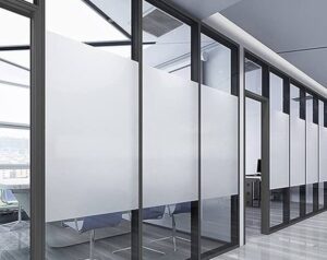 Branding: Companies use frosted glass with custom logos etched onto entry doors or partitions for branding purposes.